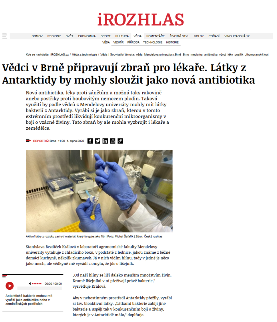 Our research on RiPPs (ribosomally-synthesized and post-translationally modified peptides) from Antarctic soil microbiomes, supported by the Czech Science Foundation (GAČR), project ID: 25-17343S, was recently featured in Czech national media. In an interview for iRozhlas, we discussed our research together with my PhD student Peter—who recently relocated to the Czech Republic after research stays in Austria and the United Kingdom.