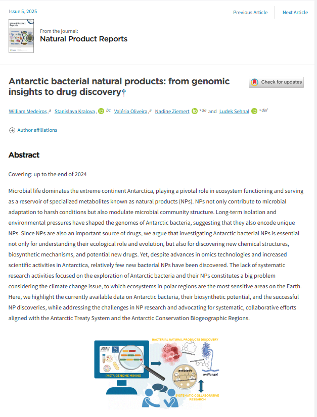 I am pleased to announce the publication of our review article in Natural Product Reports (2025, Vol. 42, pp. 774-787) titled "Antarctic bacterial natural products: from genomic insights to drug discovery".